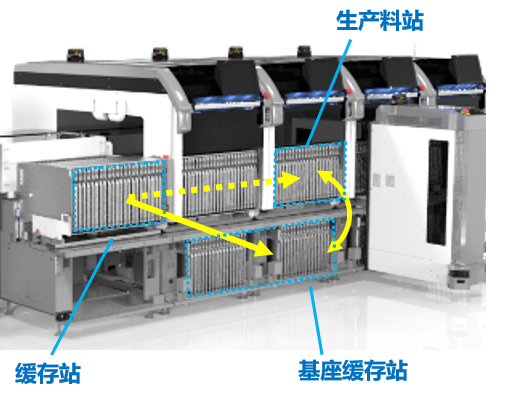 通過AGV自動更換緩存站中的供料器箱(安裝供料器的箱子),使操作員在機器前的作業量為“零”。
