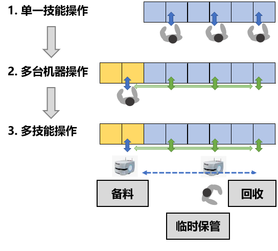 以下簡要介紹當NXTR實際導入SMT生產線,與元件相關的作業被自動化時,操作員的工作將如何改變。我們的設想是從傳統的單一技能操作員向最終的多技能操作員的轉變。(圖6)在多技能型操作中,有關元件的準備和回收作業被集中在一處,用于生產的人數變為最少。當然如果使用最少人數對應生產將增加操作員的負擔或導致停機,那人數減少就失去意義了。這些操作也可以事先在虛擬世界中進行模擬,以確保通過正確排產計劃和操作員導航工具,減少浪費和不必要的操作。