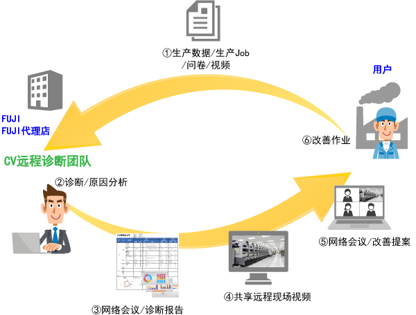 很多情況下,找出并解決降低生產效率和質量的原因并提出解決方案的難度因地因事而異。為此,FUJI建立CVPF服務平臺,并通過該平臺向每個地區提供著相同質量和速度的CV服務。